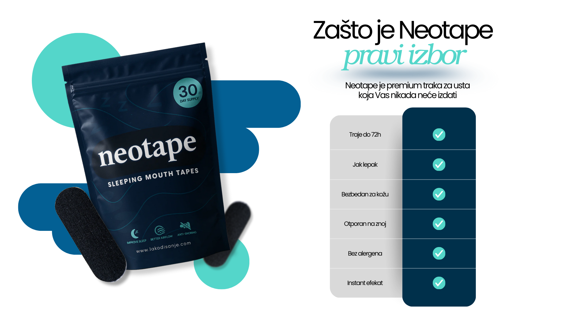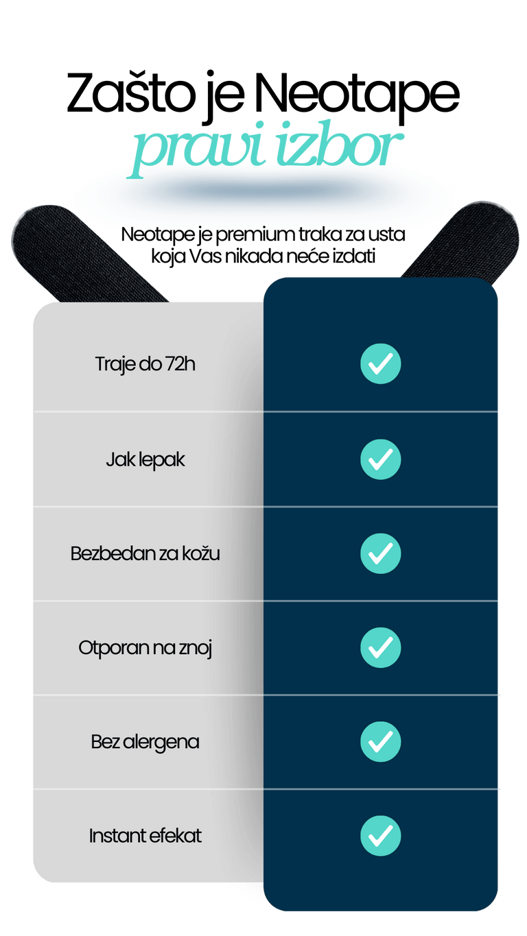 NeoTape smanjuje hrkanje i sprečava suva usta, obezbeđujući tih, udoban i neprekidan san.